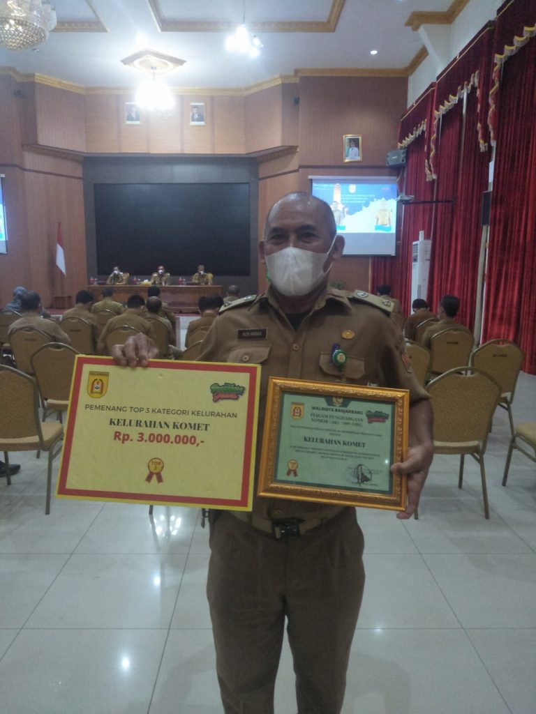 Selasa, 30 Nopember 2021 bertempat di Aula Gawi Sabarataan Kota Banjarbaru Lurah Komet Bapak Nor Akbar menerima Piagam Penghargaan Dari Walikota Banjarbaru Bapak H.M. Aditya Mufti Ariffin,SH,MH atas Predikat Tertinggi Terhadap Standar Pelayanan Publik Tahun 2021 ( TOP 3 ) Se-Kota Banjarbaru..semoga kedepannya dengan diberikannya apresiasi dari Pemerintah Kota Banjarbaru terhadap pelayanan publik ini bisa meningkatkan lagi mutu pelayanan kepada masyarakat khususnya warga Komet dan umumnya kepada warga Kota Banjarbaru, harap Lurah Komet.