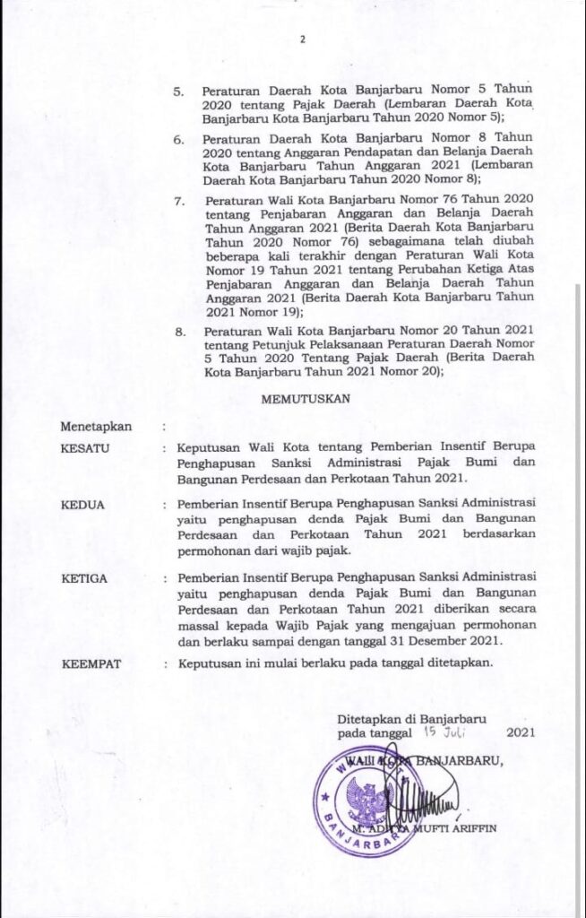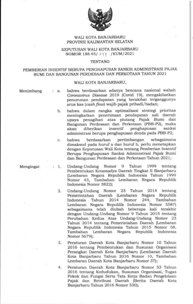 SK Walikota Banjarbaru Nomor : 188.45/217/KUM/2021 Tentang “Pemberian Insentif Berupa Penghapusan Sanksi Administrasi Pajak Bumi dan Bangunan Perdesaan dan Perkotaan Tahun 2021”